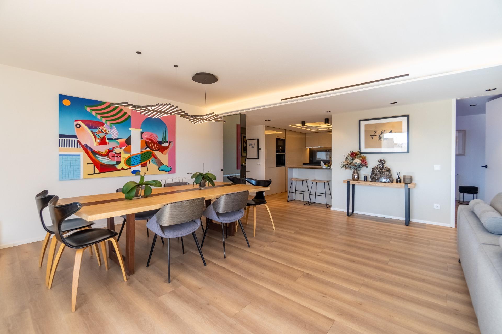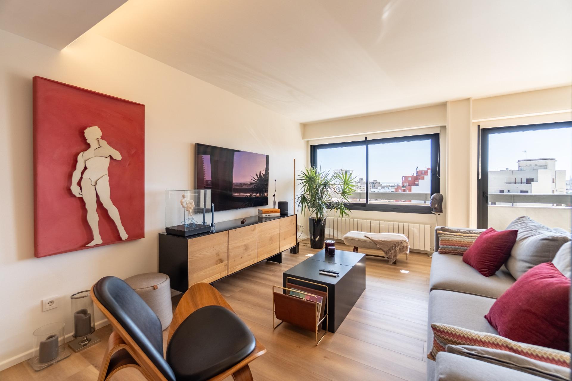 Ático moderno y luminoso en novena planta, renovado en 2021/22 con materiales de alta calidad. El salón-comedor con grandes ventanales ofrece vistas panorámicas a la ciudad y al mar, y se abre a una terraza sur con vistas despejadas. Cocina abierta de diseño, equipada con primeras marcas y almacenamiento optimizado.