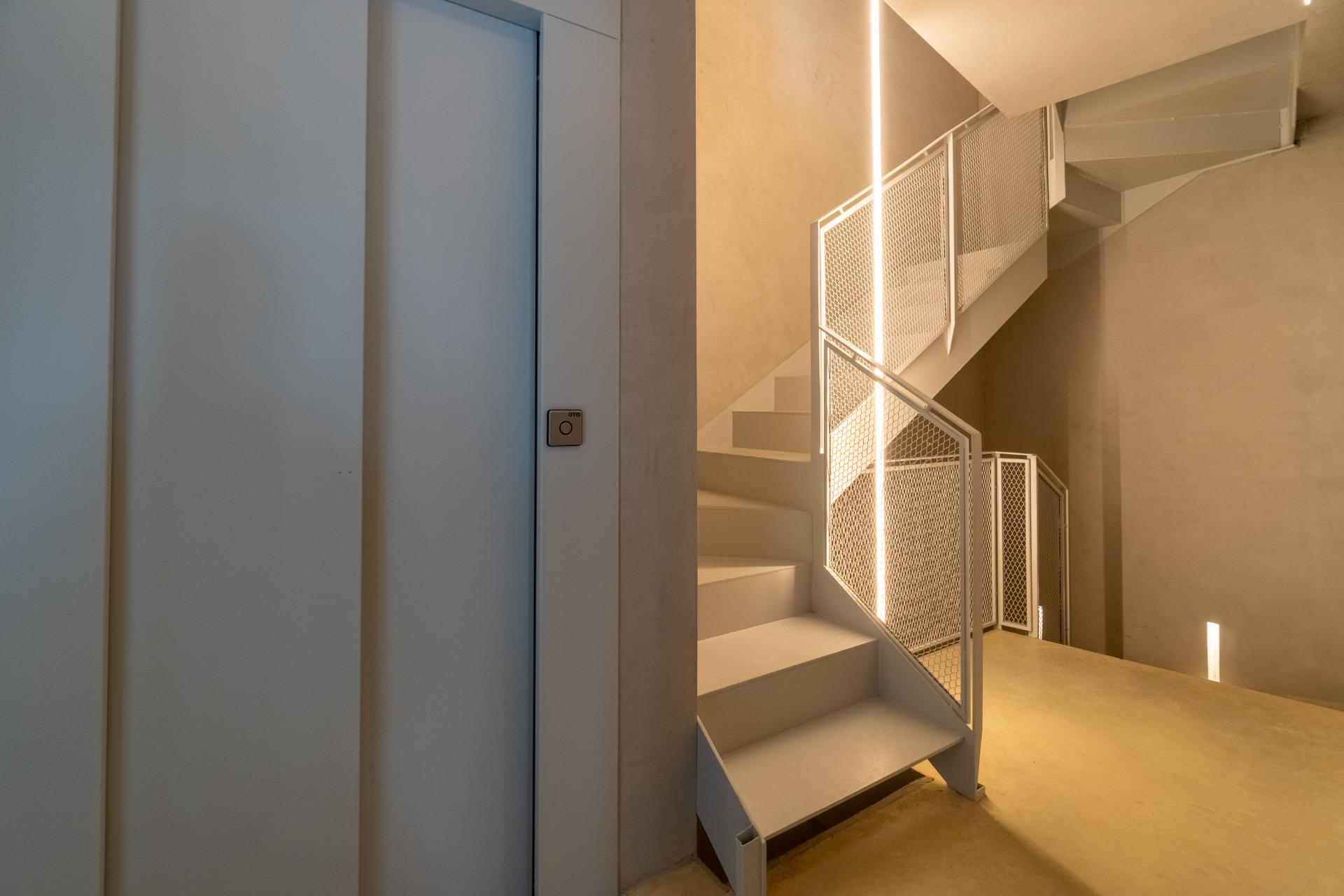 Distribuida en varios niveles conectados por ascensor y escalera metálica, esta vivienda vertical incluye una sala de estar de doble altura con ventanales panorámicos, cocina de diseño geométrico en acero inoxidable, y una master suite con vistas ininterrumpidas al mar. Los materiales predominantes son el hormigón visto, metales oscuros y superficies pulidas.