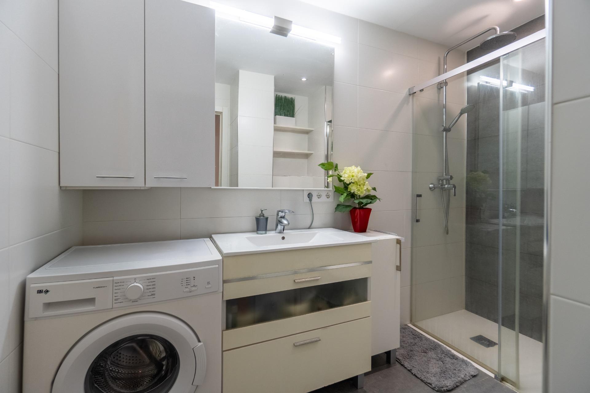 La vivienda presenta un espacio principal moderno y acogedor, con un salón-comedor muy luminoso y una cocina abierta totalmente equipada. Desde esta estancia se accede a una agradable terraza privada con vistas parciales al mar y al entorno natural.