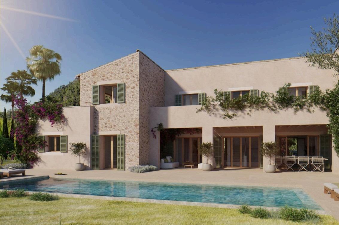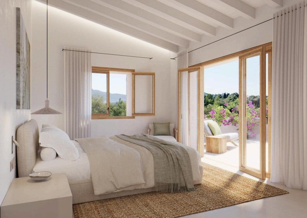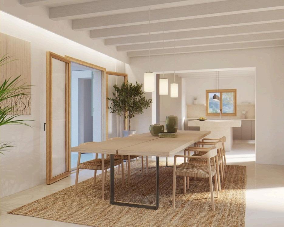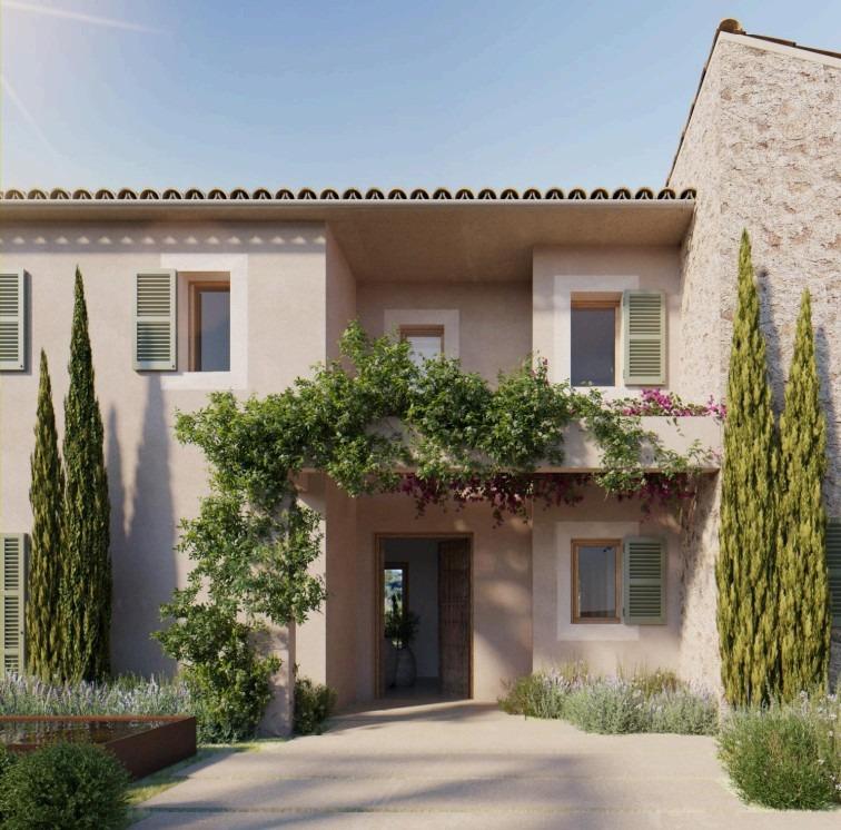 Los acabados incluirán muros de piedra natural mallorquina, detalles en acero corten, madera de roble natural y tonos blancos cálidos.